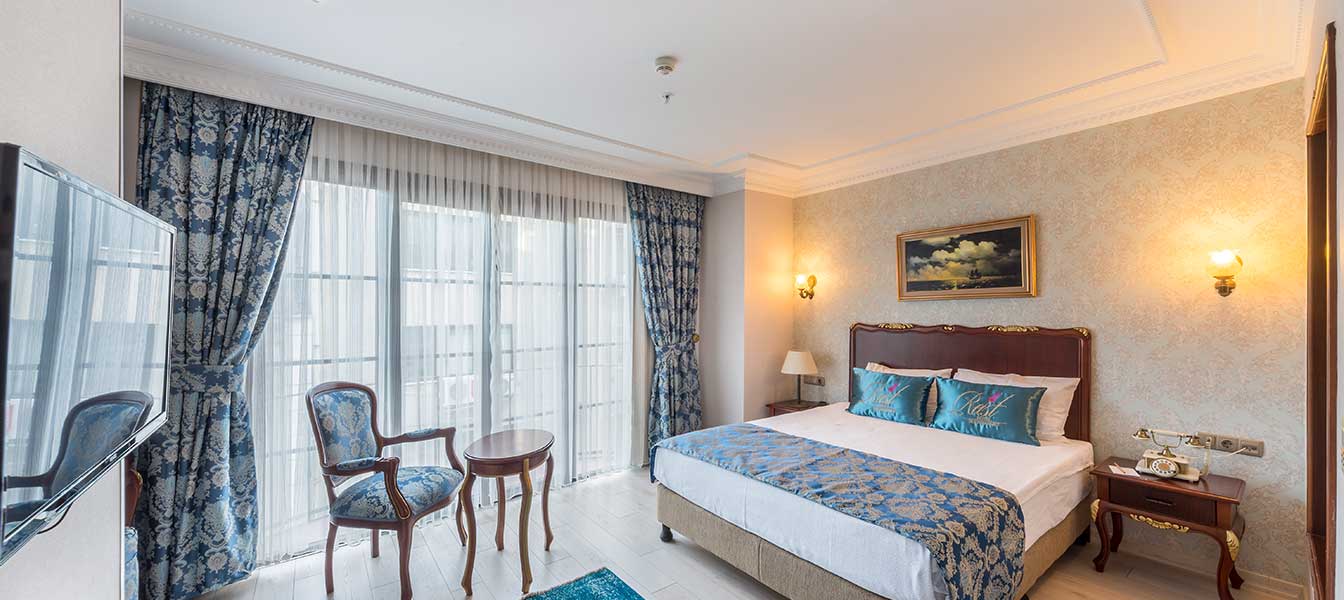 Double rooms for rent in hotel Istanbul are ideal for families with children as well as couples. When you are booking the room with us, you either have the choice of taking a French bed or twin beds. The French bed is ideal for couples while the twin beds are best for two children or adults travelling together. The double room is also coupled with an elegant yet modern balcony and French doors which will let in the day’s refreshing air.