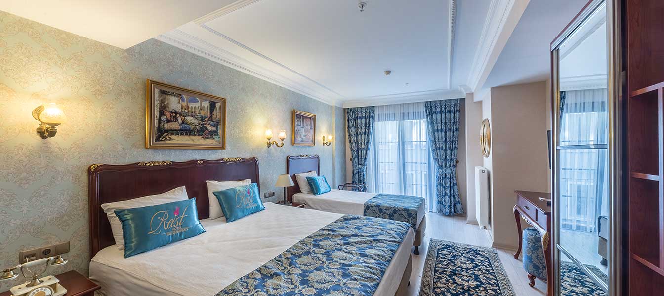 The family room offered by the Rast hotel is perfect for parents accompanied with a child. These family rooms for rent in hotel Istanbul have the option of one king size bed along with a single bed. These rooms are much more spacious than the standard or double rooms and the balconies help in keeping the room airy and refreshing. You will find every facility that you need within these rooms and if you require anything else, just let us know and we’ll be happy to help you. If you are wondering what exactly you can find in these rooms, wonder no more because we are here to tell you exactly what we offer.